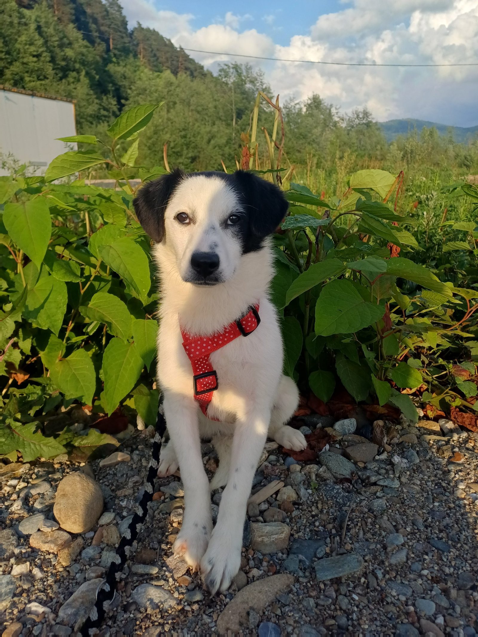 Sie lernt gerade, ein Geschirr zu tragen und an der Leine zu laufen und macht dabei tolle Fortschritte. Streicheleinheiten mag sie.
